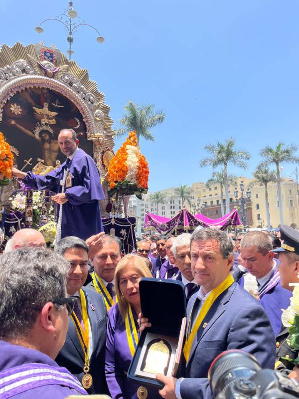 El Señor de los Milagros ingresó hoy a la Plaza de Armas de Lima pasada las 11 am, siendo recibido por una multitud en impresionante testimonio de fe y devoción al histórico cristo de Pachacamilla. Renzo Reggiardo Barreto, alcalde de las Tres Veces Coronada Ciudad de los Reyes, le rindió homenaje en la puerta principal del Palacio Municipal y luego cargó las pesadas andas acompañado de miembros de la Hermandad del Señor de los Milagros.